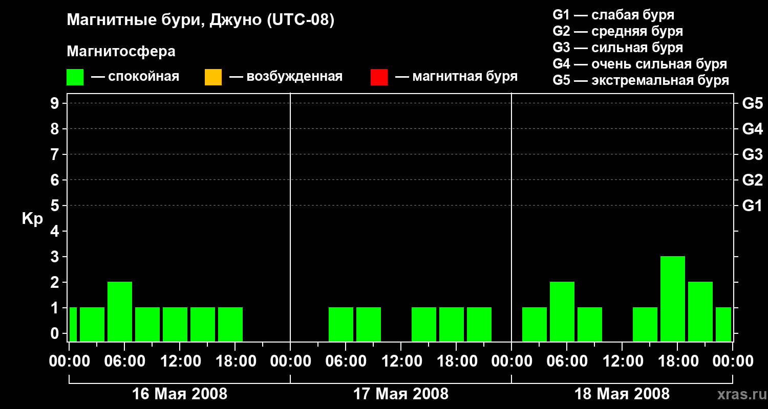 Изменения геомагнитного индекса Kp с 16 по 18 мая 2008 года для средних широт