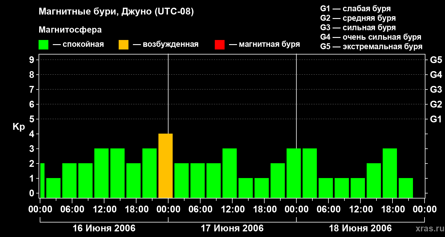 Изменения геомагнитного индекса Kp с 16 по 18 июня 2006 года для средних широт