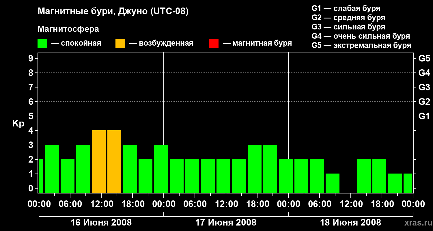 Изменения геомагнитного индекса Kp с 16 по 18 июня 2008 года для средних широт