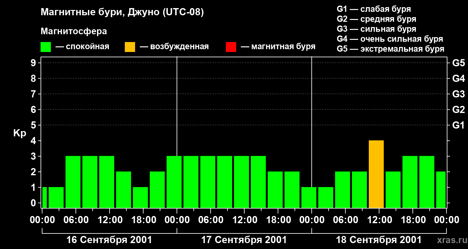Изменения геомагнитного индекса Kp с 16 по 18 сентября 2001 года для средних широт