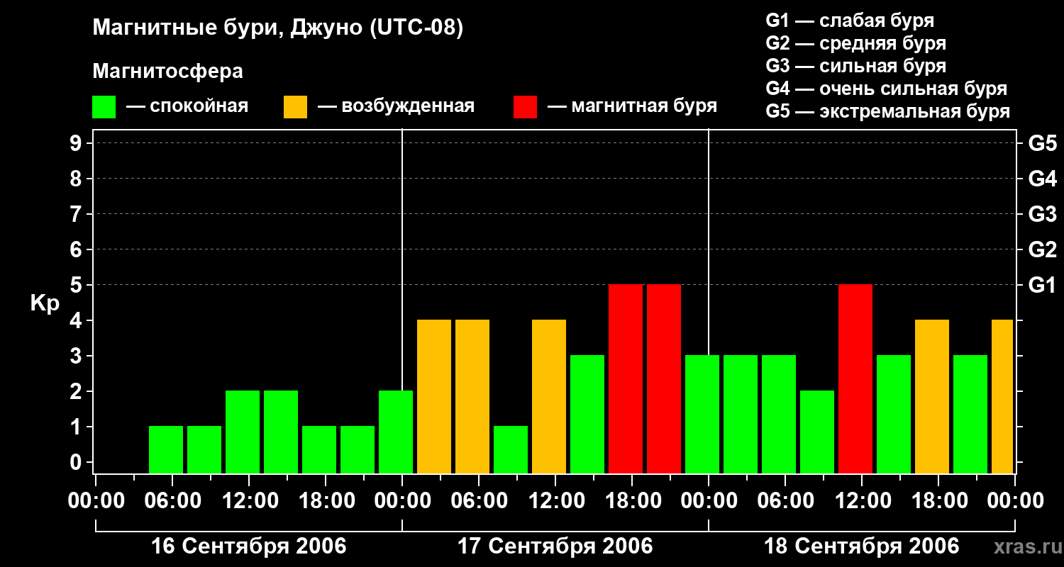 Изменения геомагнитного индекса Kp с 16 по 18 сентября 2006 года для средних широт