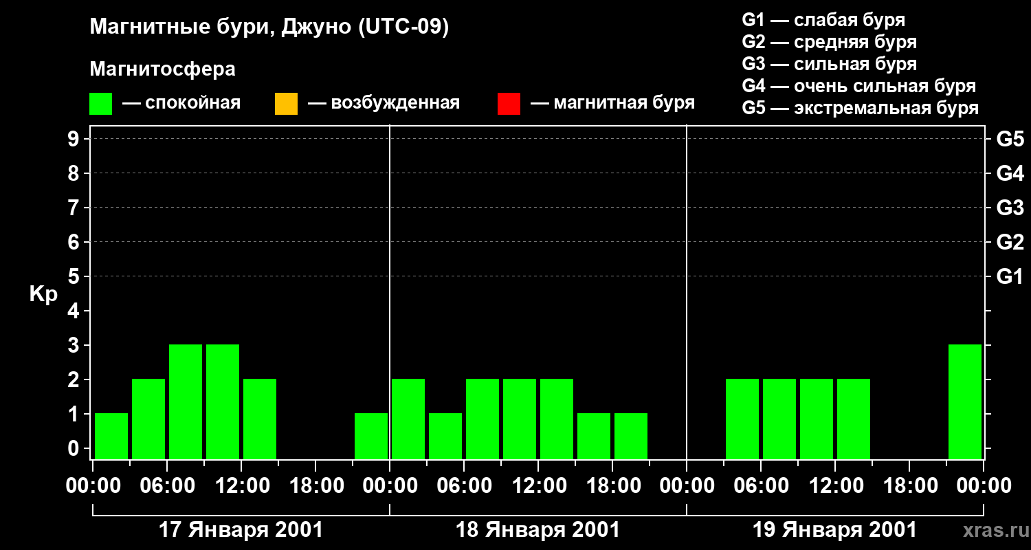 Изменения геомагнитного индекса Kp с 17 по 19 января 2001 года для средних широт
