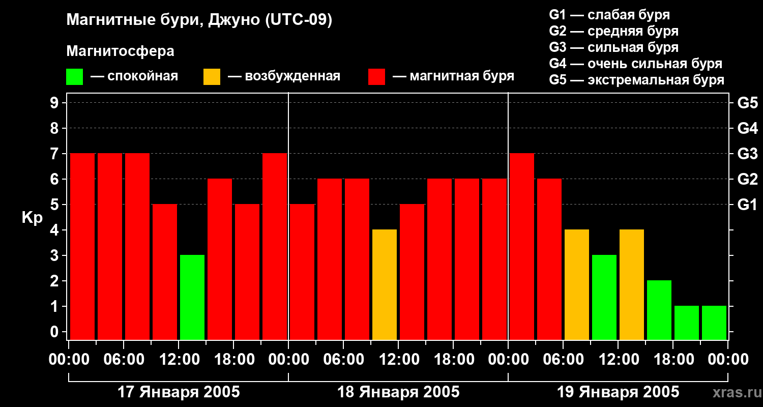 Изменения геомагнитного индекса Kp с 17 по 19 января 2005 года для средних широт