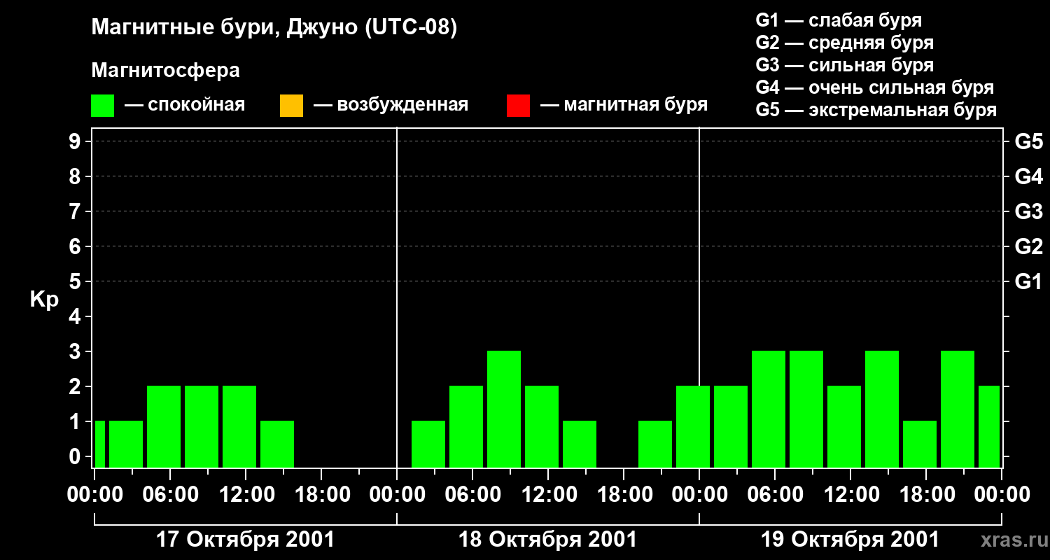 Изменения геомагнитного индекса Kp с 17 по 19 октября 2001 года для средних широт