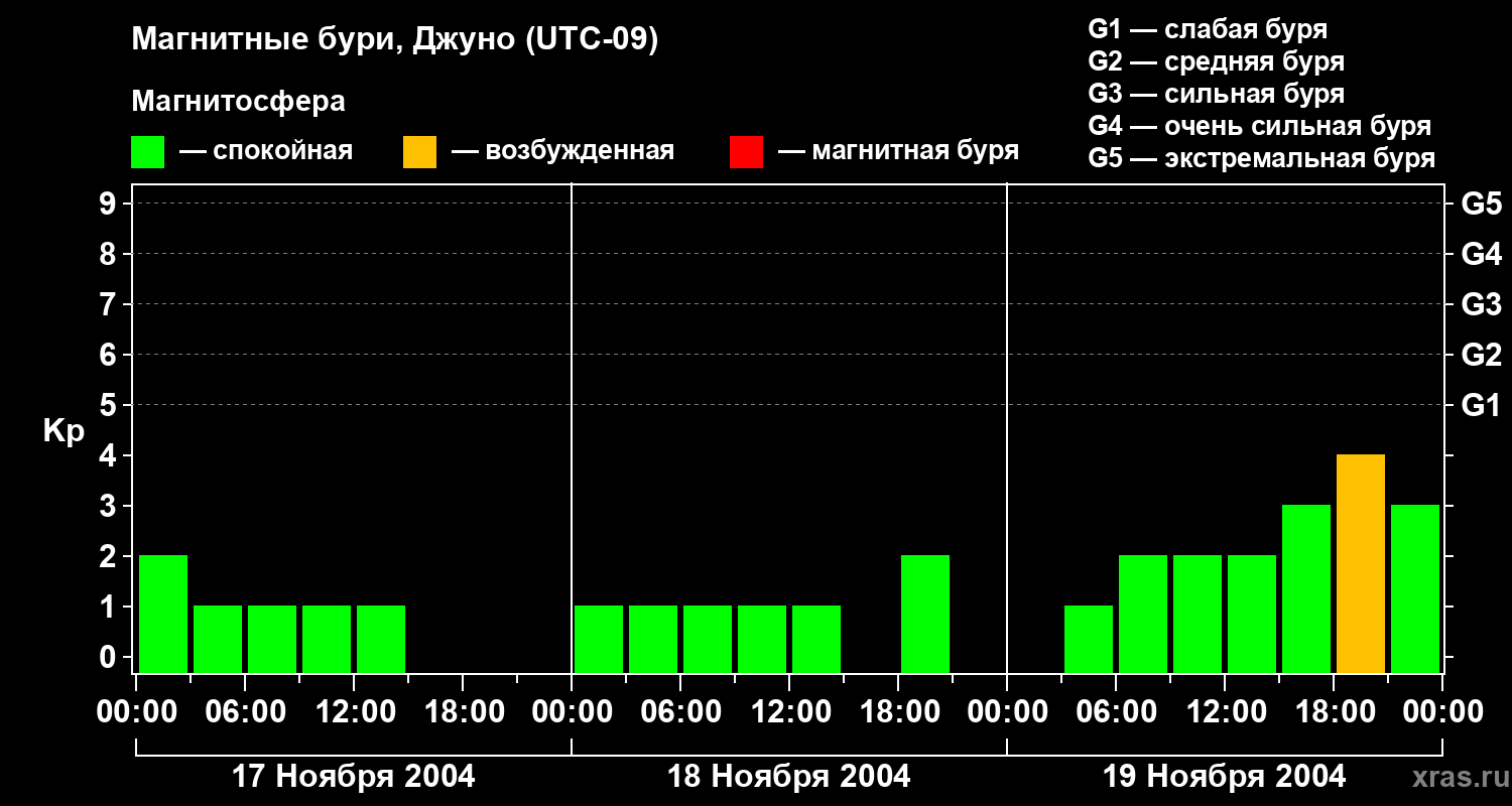 Изменения геомагнитного индекса Kp с 17 по 19 ноября 2004 года для средних широт