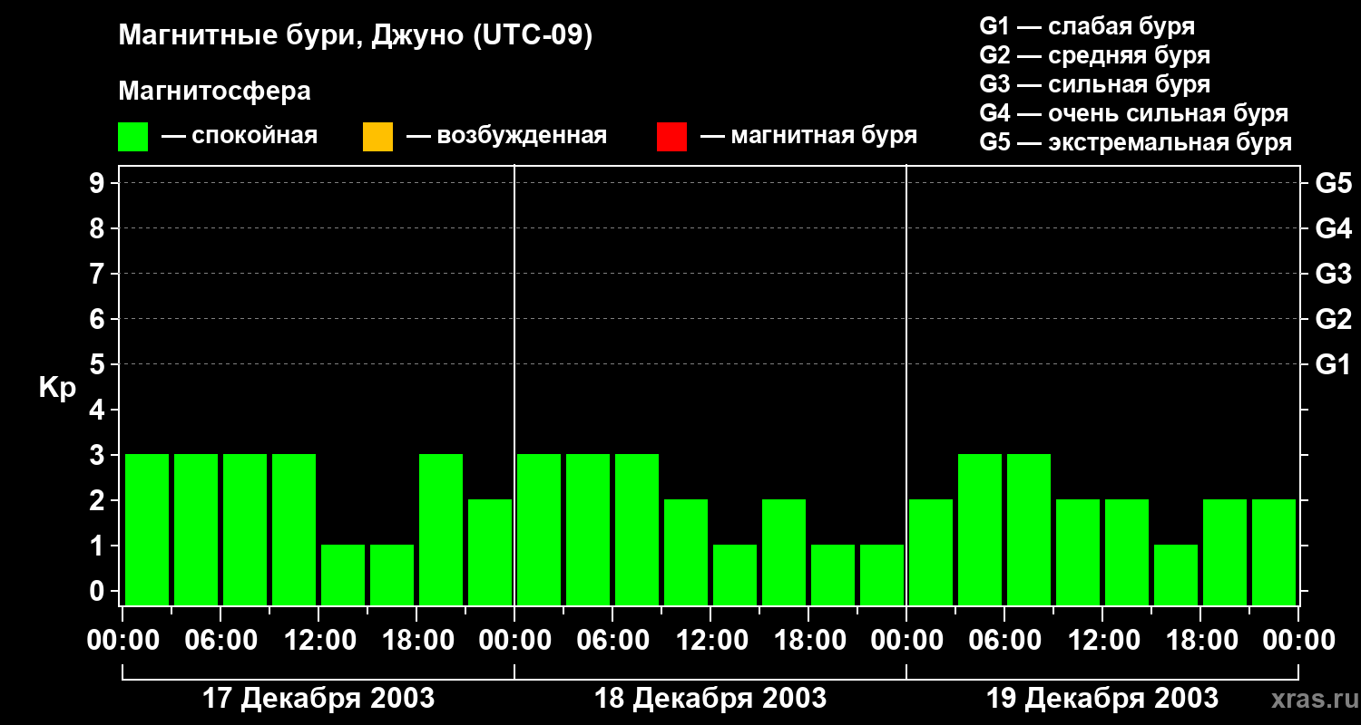 Изменения геомагнитного индекса Kp с 17 по 19 декабря 2003 года для средних широт