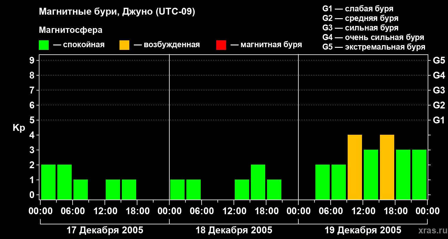Изменения геомагнитного индекса Kp с 17 по 19 декабря 2005 года для средних широт