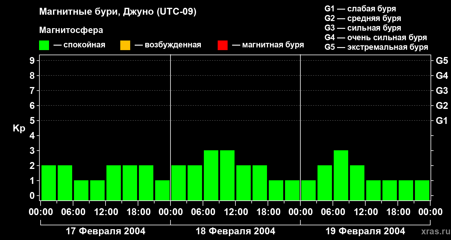 Изменения геомагнитного индекса Kp с 17 по 19 февраля 2004 года для средних широт