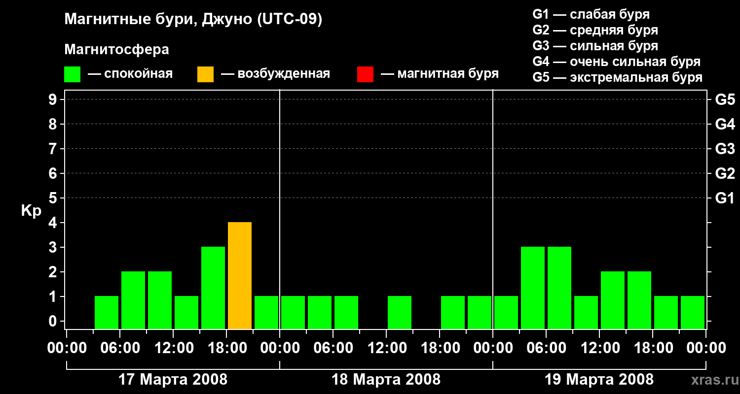 Изменения геомагнитного индекса Kp с 17 по 19 марта 2008 года для средних широт