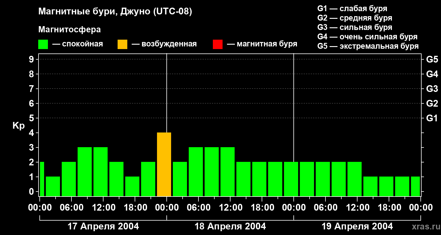 Изменения геомагнитного индекса Kp с 17 по 19 апреля 2004 года для средних широт