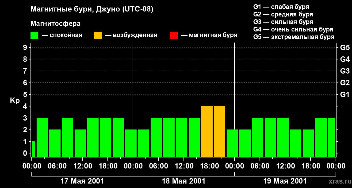 Изменения геомагнитного индекса Kp с 17 по 19 мая 2001 года для средних широт