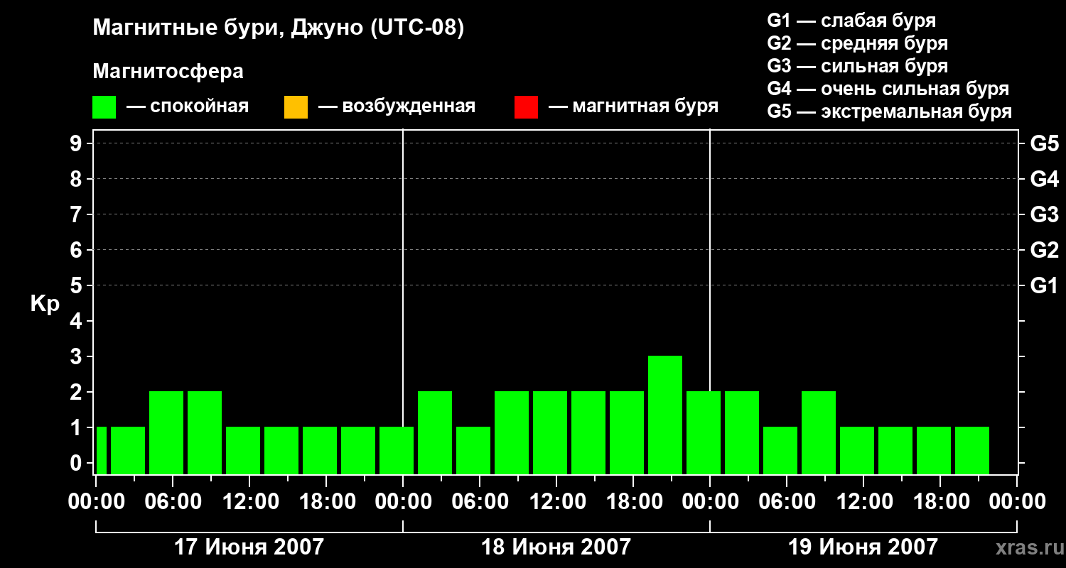 Изменения геомагнитного индекса Kp с 17 по 19 июня 2007 года для средних широт
