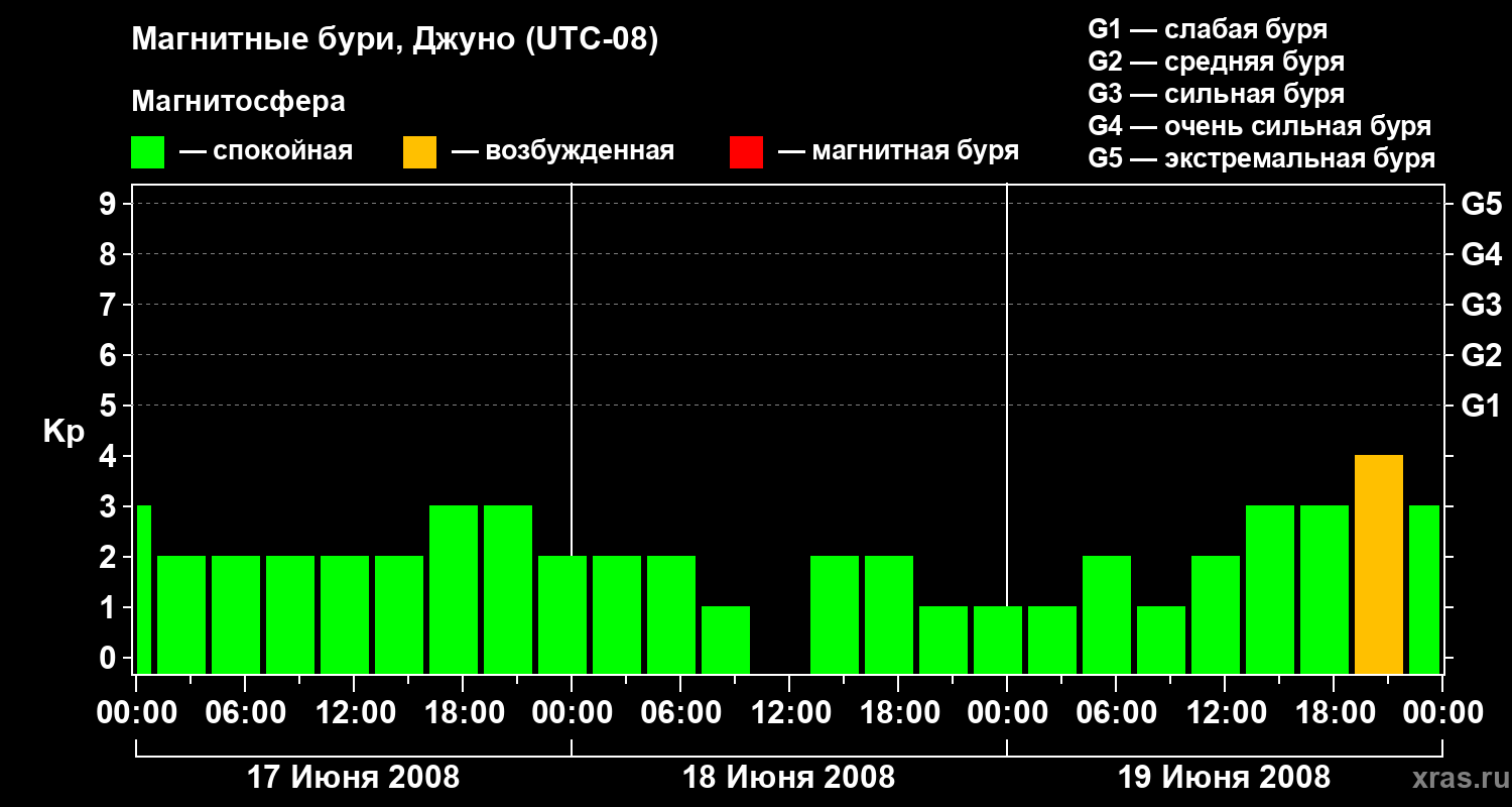 Изменения геомагнитного индекса Kp с 17 по 19 июня 2008 года для средних широт