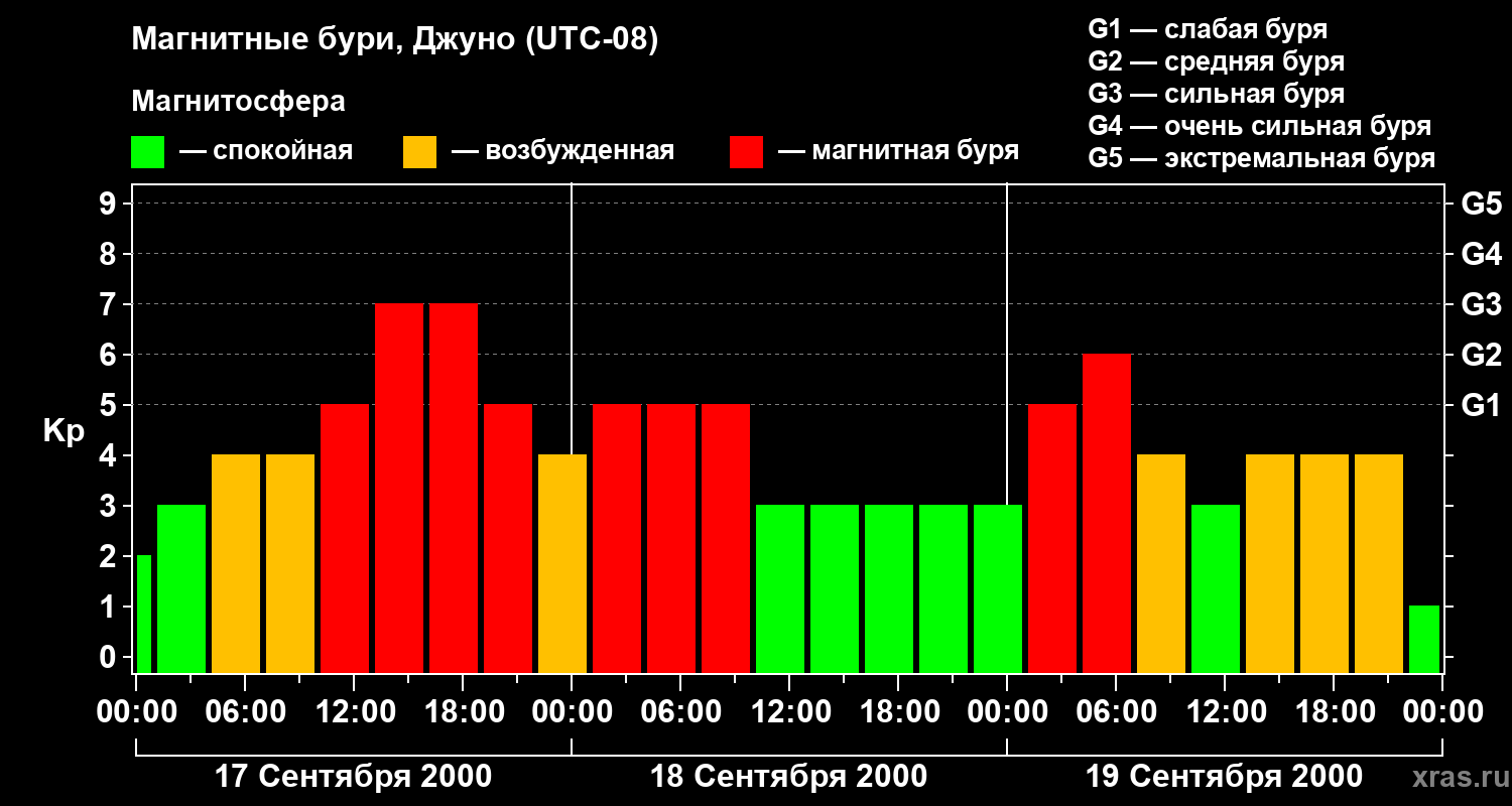Изменения геомагнитного индекса Kp с 17 по 19 сентября 2000 года для средних широт