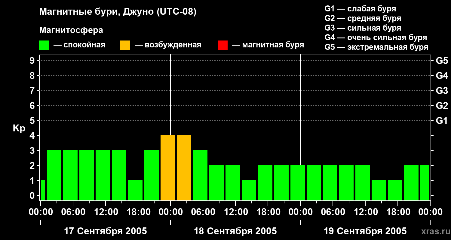 Изменения геомагнитного индекса Kp с 17 по 19 сентября 2005 года для средних широт