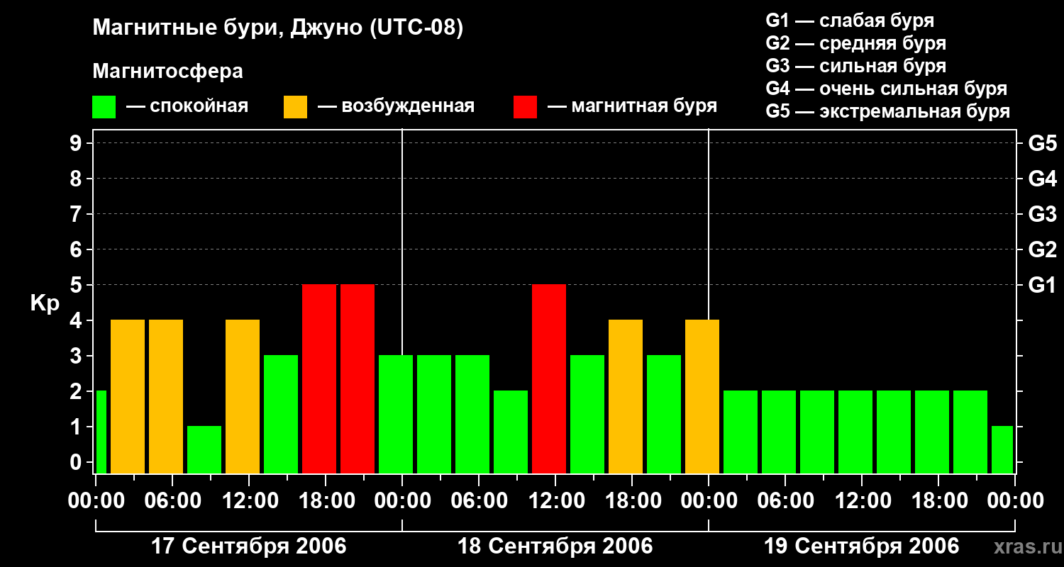Изменения геомагнитного индекса Kp с 17 по 19 сентября 2006 года для средних широт