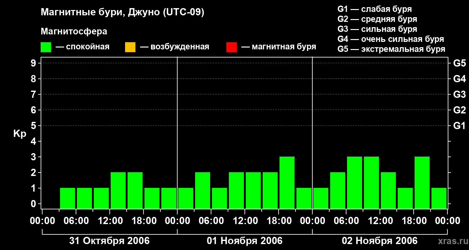 Изменения геомагнитного индекса Kp с 31 октября по 2 ноября 2006 года для средних широт