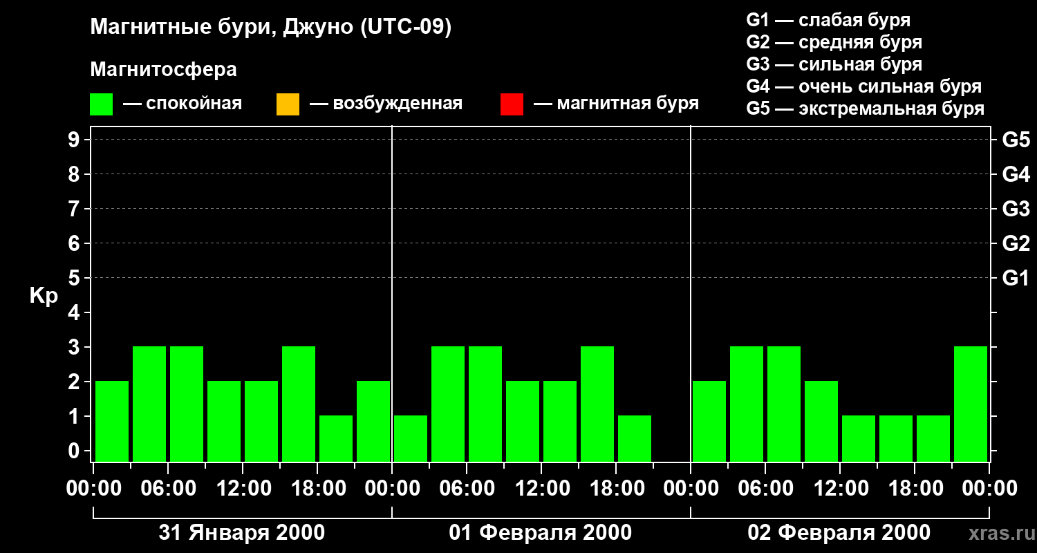 Изменения геомагнитного индекса Kp с 31 января по 2 февраля 2000 года для средних широт