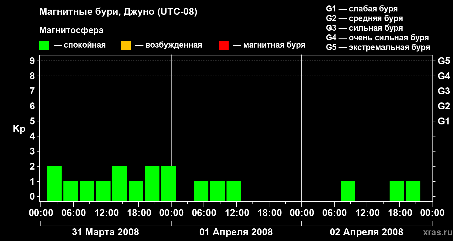 Изменения геомагнитного индекса Kp с 31 марта по 2 апреля 2008 года для средних широт