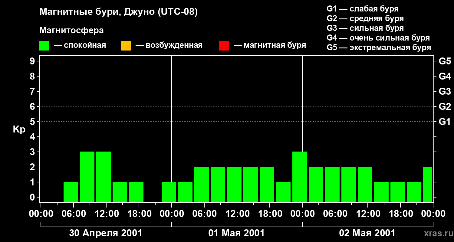Изменения геомагнитного индекса Kp с 30 апреля по 2 мая 2001 года для средних широт