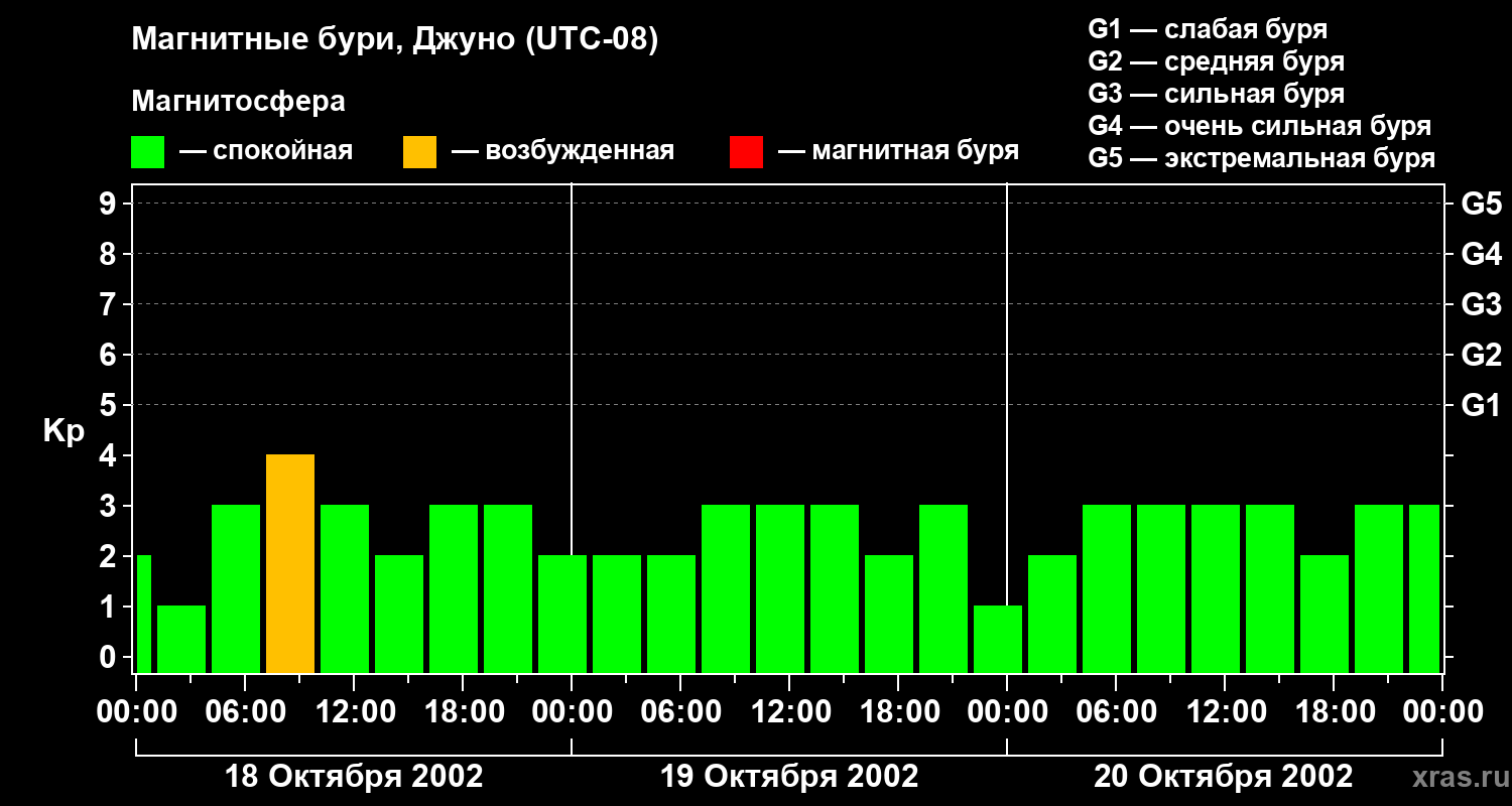 Изменения геомагнитного индекса Kp с 18 по 20 октября 2002 года для средних широт