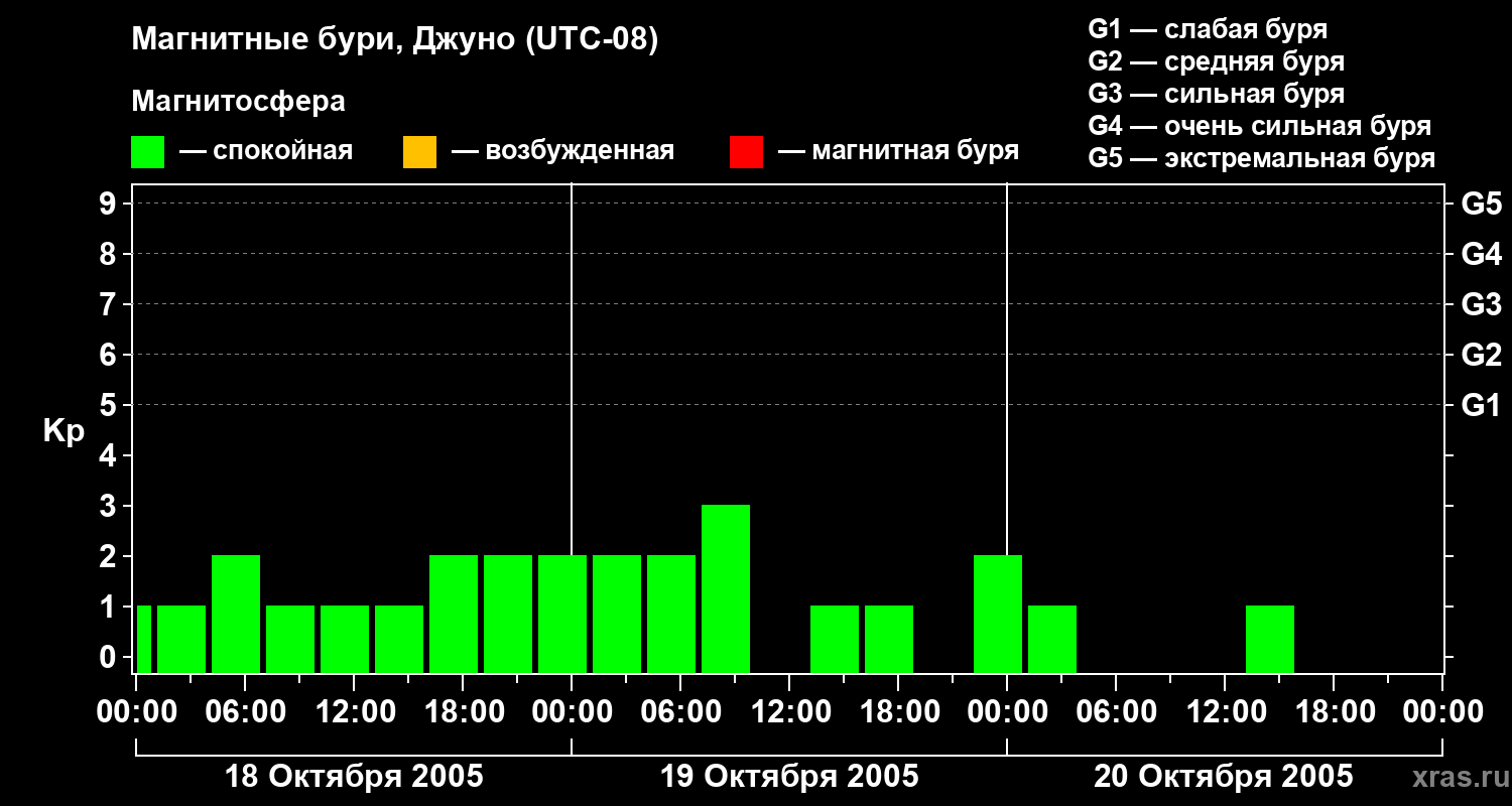Изменения геомагнитного индекса Kp с 18 по 20 октября 2005 года для средних широт
