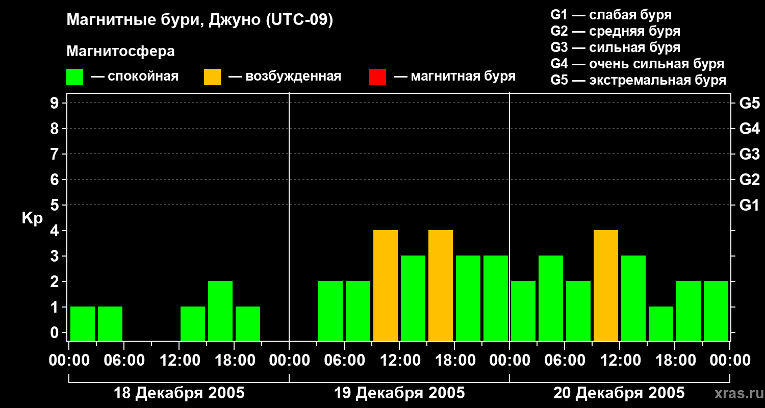 Изменения геомагнитного индекса Kp с 18 по 20 декабря 2005 года для средних широт