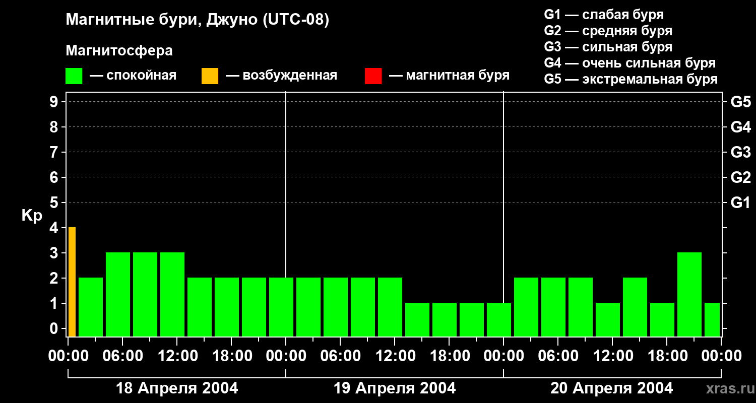 Изменения геомагнитного индекса Kp с 18 по 20 апреля 2004 года для средних широт