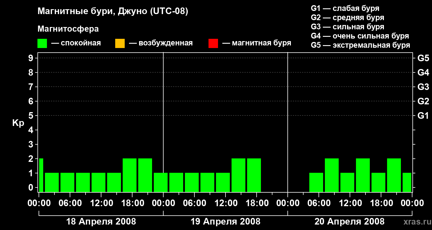 Изменения геомагнитного индекса Kp с 18 по 20 апреля 2008 года для средних широт