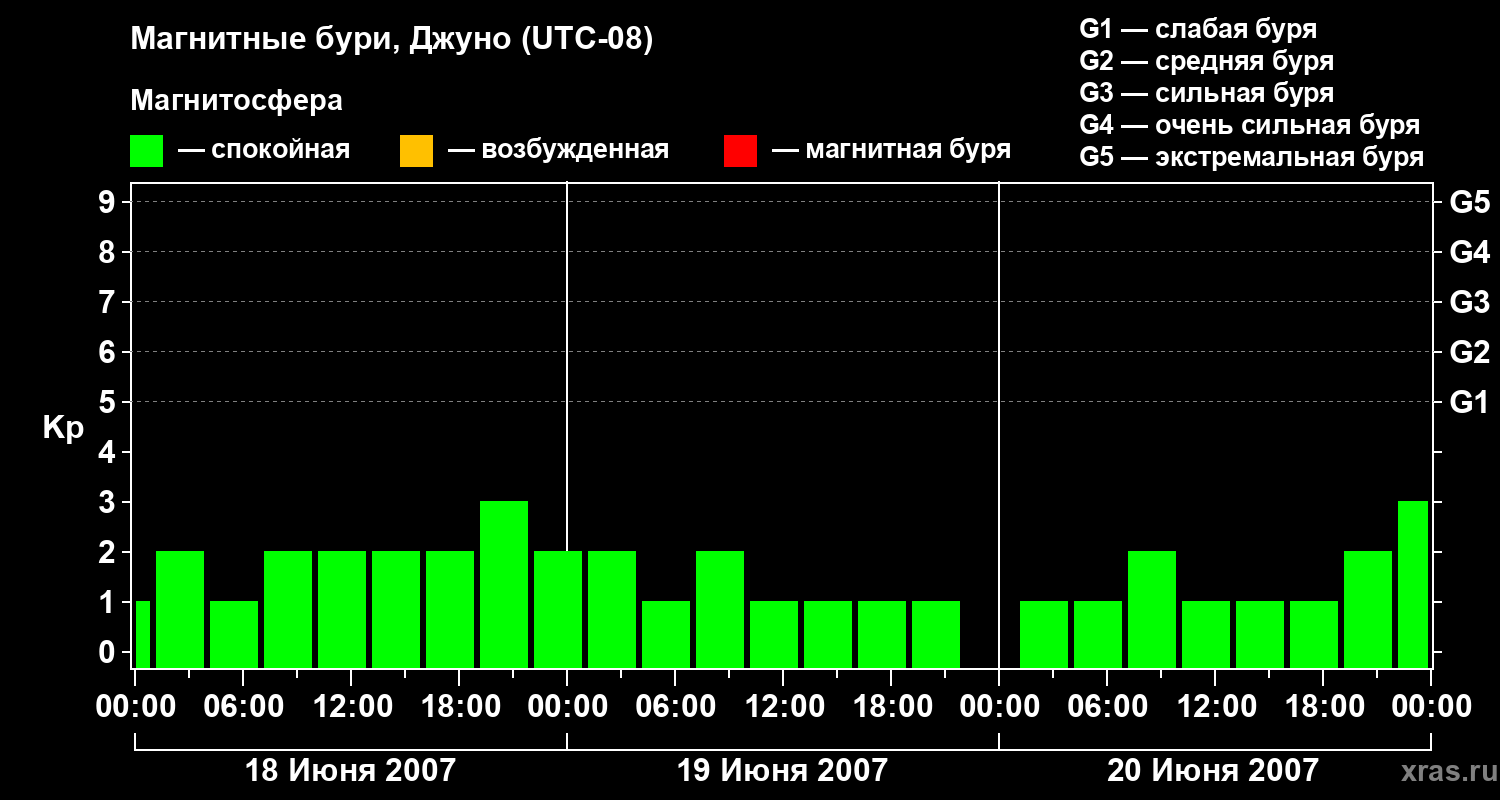 Изменения геомагнитного индекса Kp с 18 по 20 июня 2007 года для средних широт