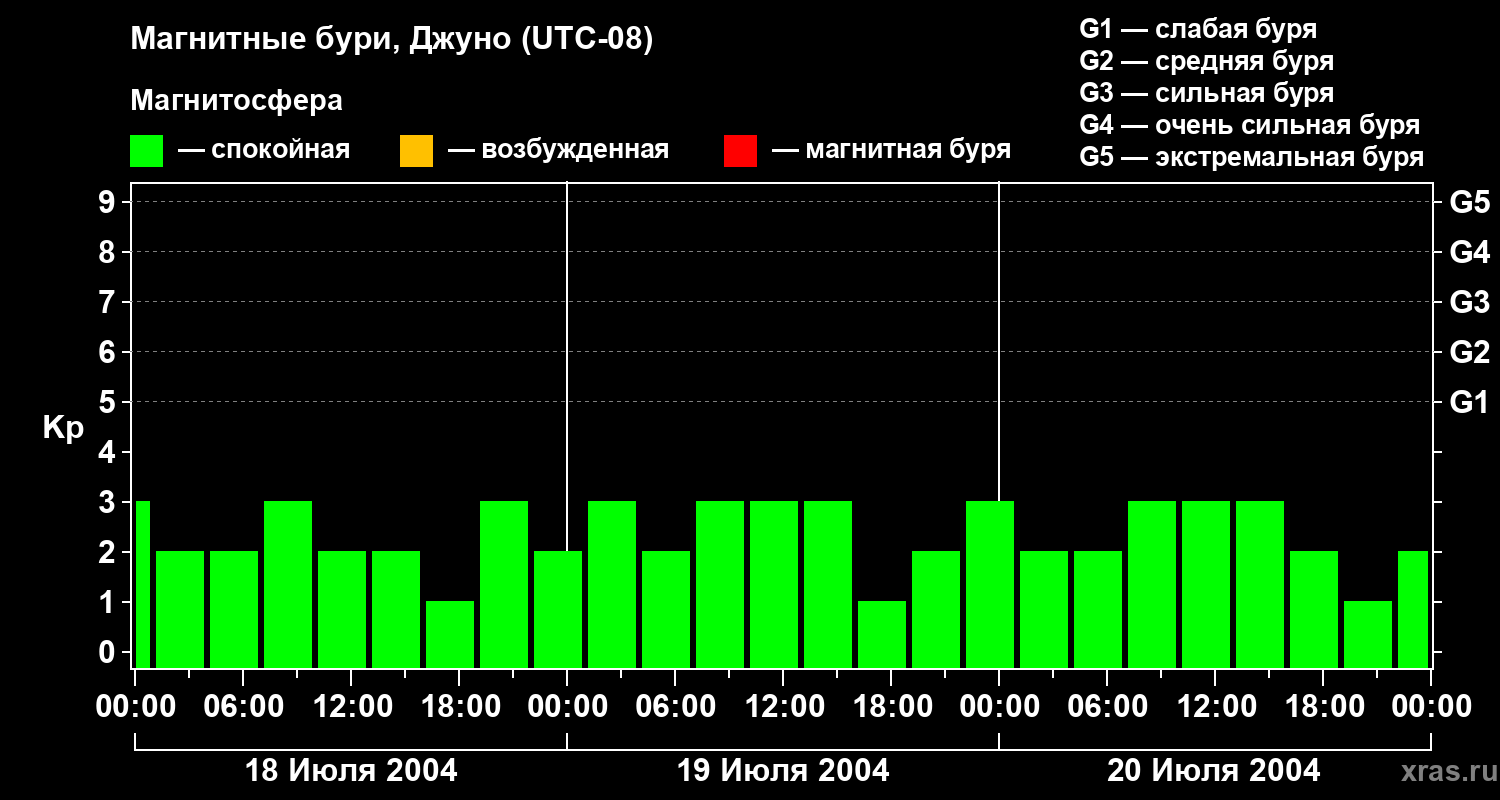 Изменения геомагнитного индекса Kp с 18 по 20 июля 2004 года для средних широт