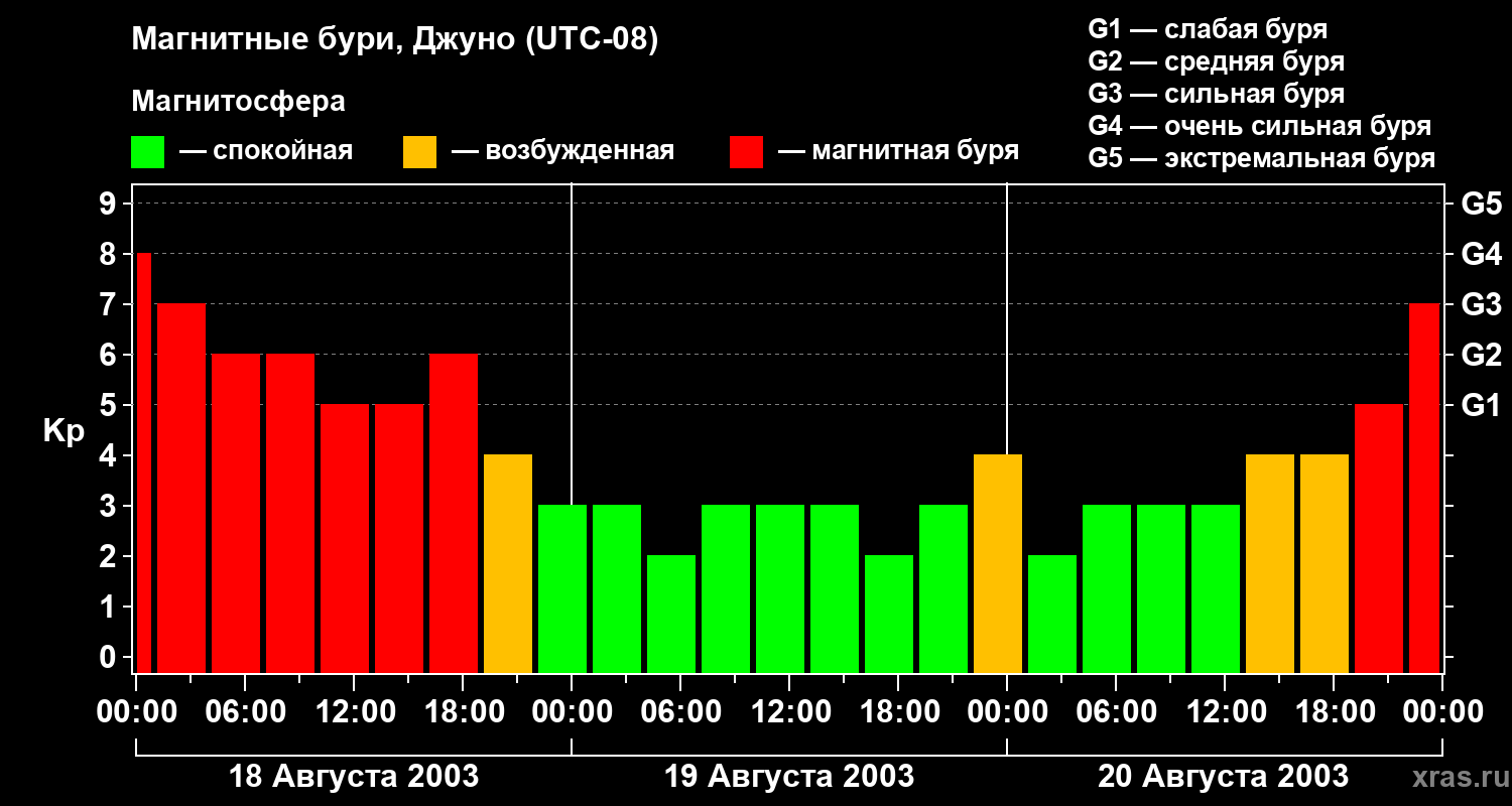 Изменения геомагнитного индекса Kp с 18 по 20 августа 2003 года для средних широт