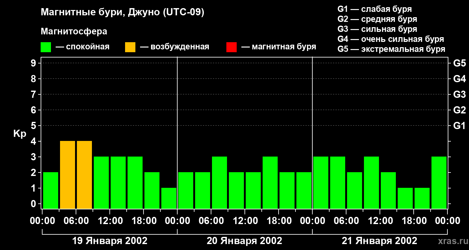 Изменения геомагнитного индекса Kp с 19 по 21 января 2002 года для средних широт