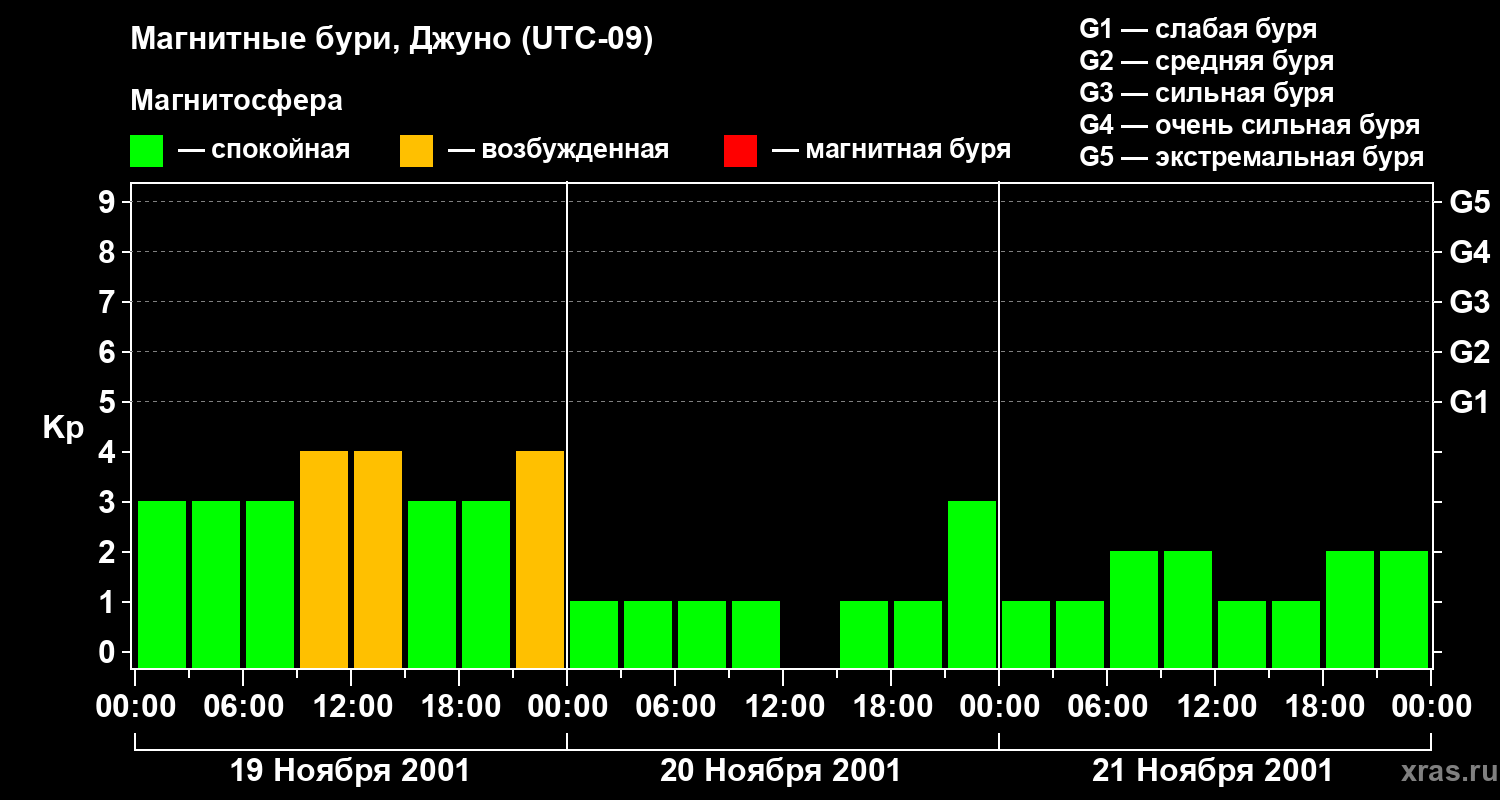 Изменения геомагнитного индекса Kp с 19 по 21 ноября 2001 года для средних широт