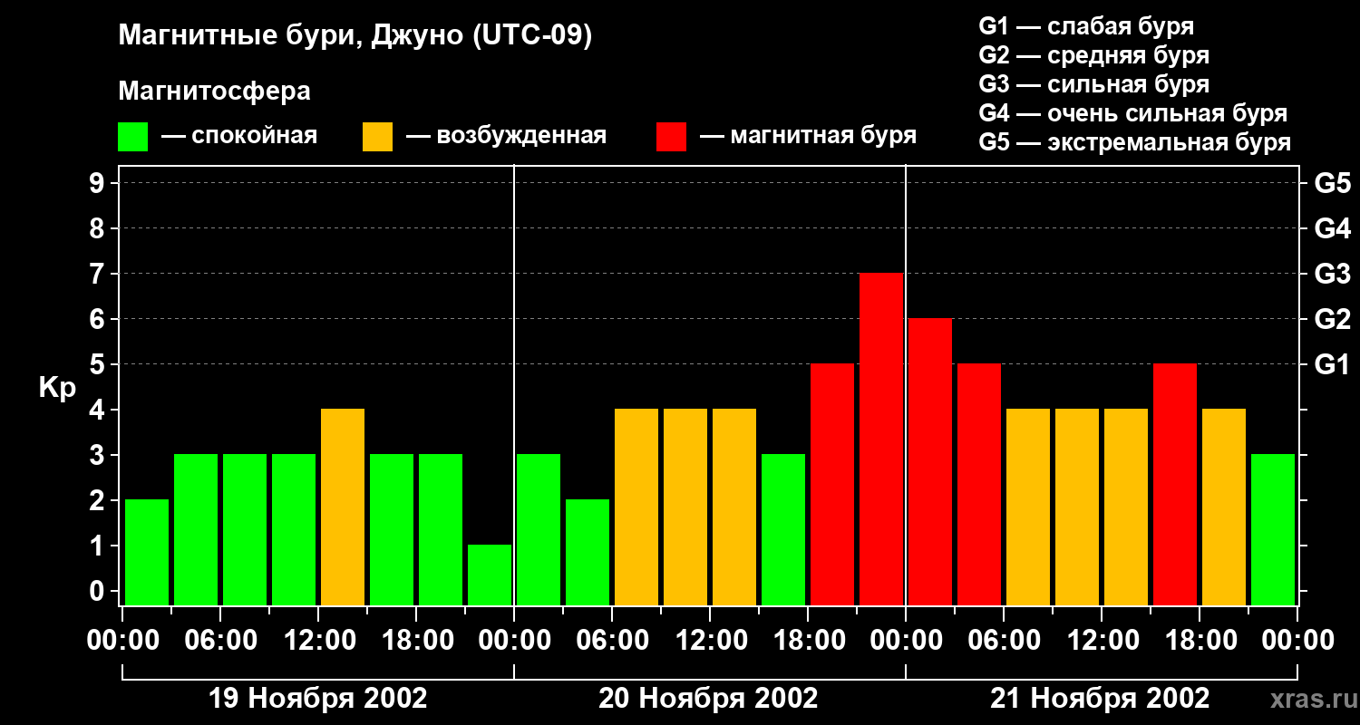 Изменения геомагнитного индекса Kp с 19 по 21 ноября 2002 года для средних широт