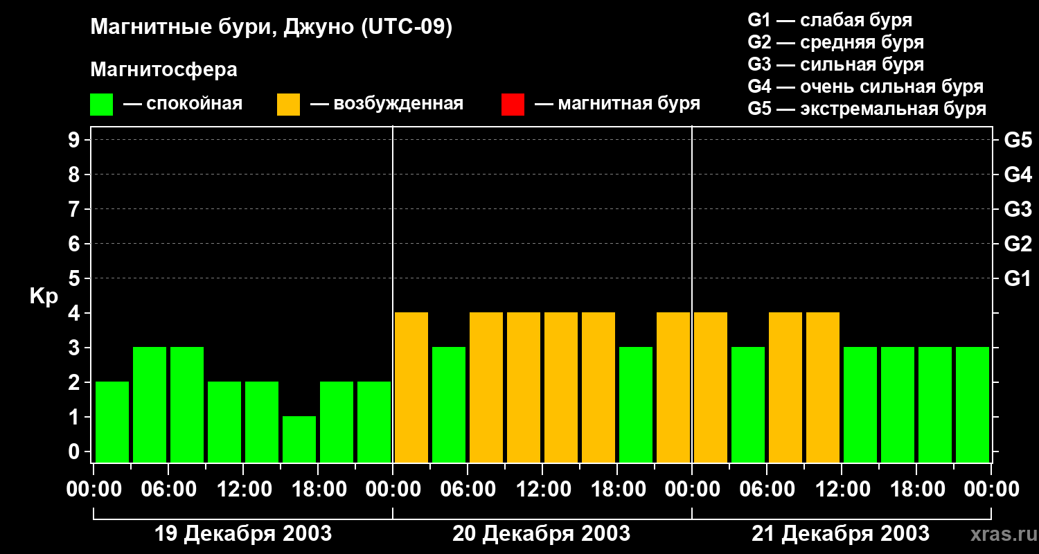 Изменения геомагнитного индекса Kp с 19 по 21 декабря 2003 года для средних широт