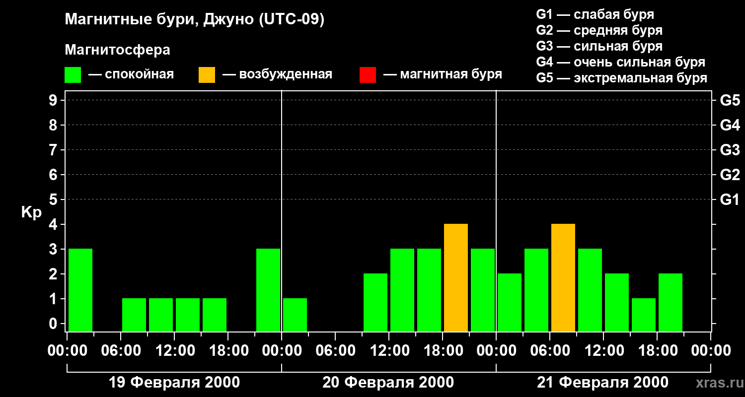 Изменения геомагнитного индекса Kp с 19 по 21 февраля 2000 года для средних широт