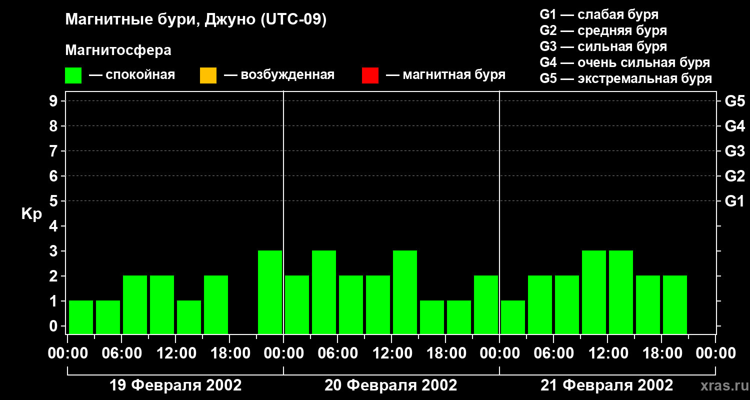 Изменения геомагнитного индекса Kp с 19 по 21 февраля 2002 года для средних широт