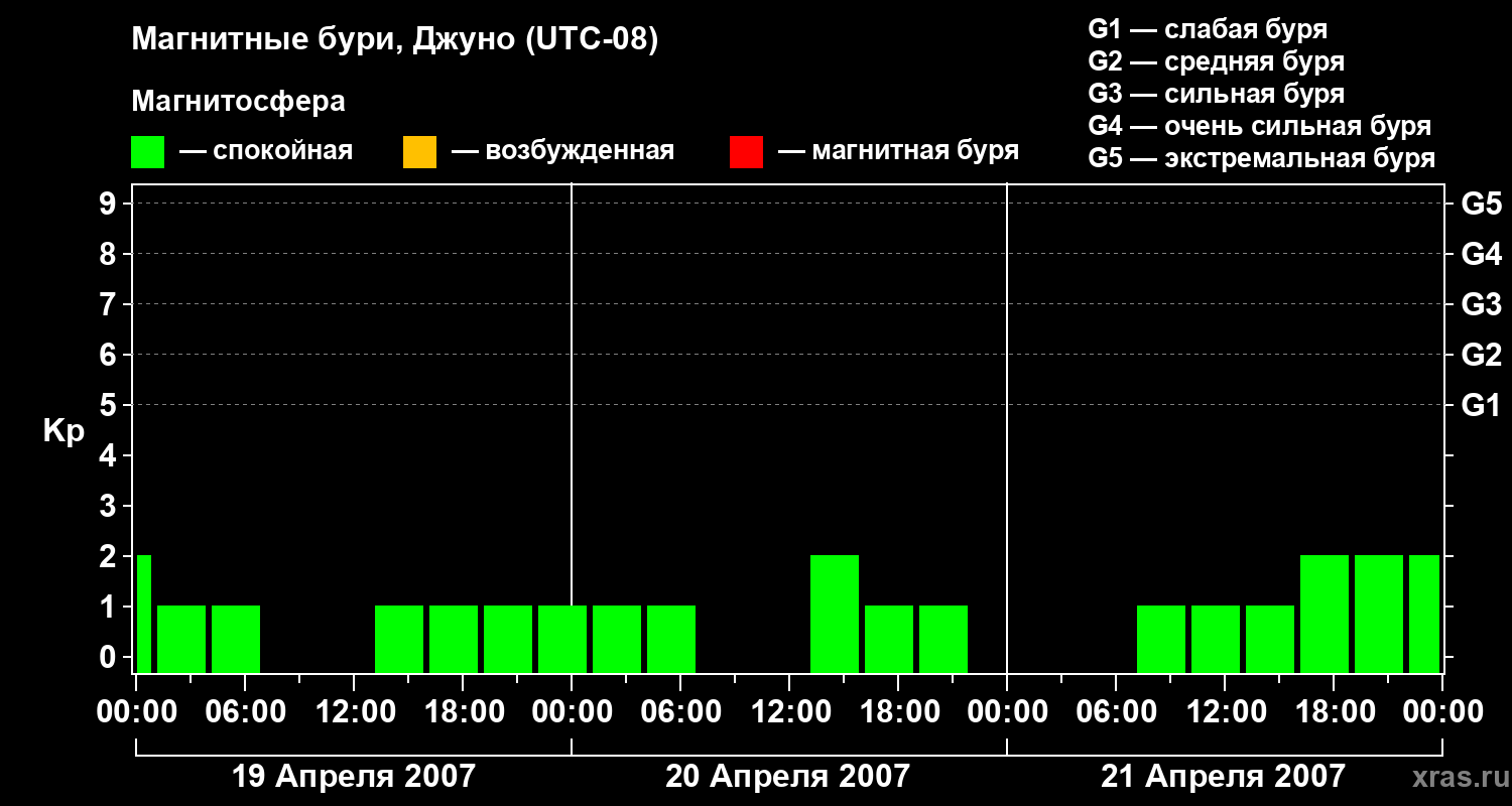 Изменения геомагнитного индекса Kp с 19 по 21 апреля 2007 года для средних широт