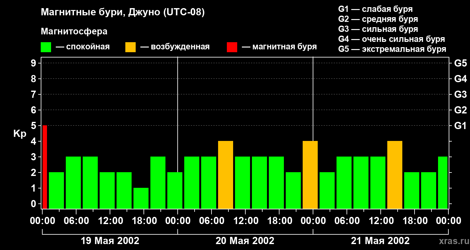 Изменения геомагнитного индекса Kp с 19 по 21 мая 2002 года для средних широт