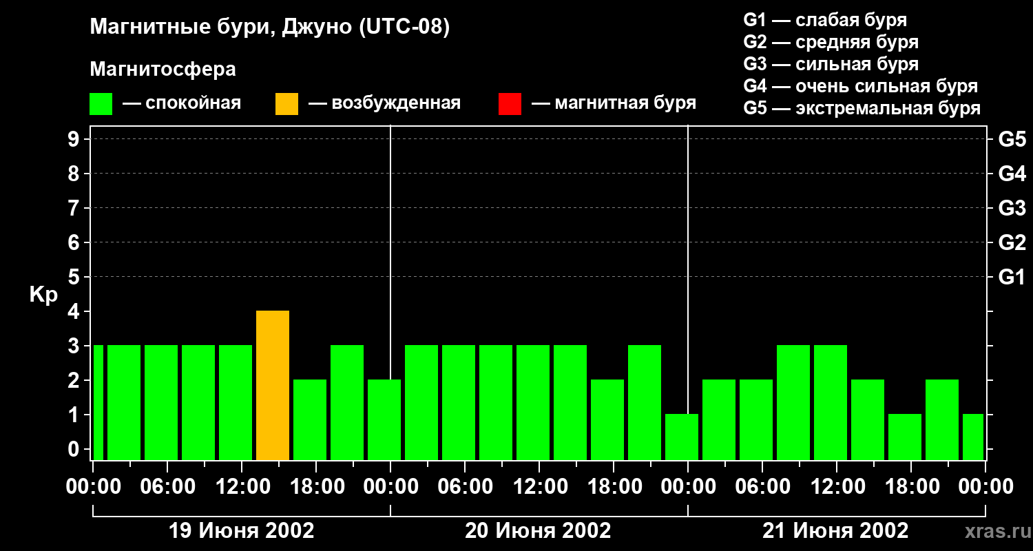 Изменения геомагнитного индекса Kp с 19 по 21 июня 2002 года для средних широт