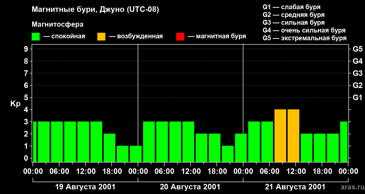 Изменения геомагнитного индекса Kp с 19 по 21 августа 2001 года для средних широт