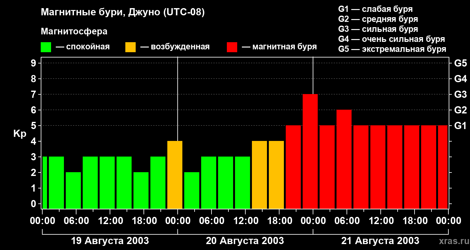 Изменения геомагнитного индекса Kp с 19 по 21 августа 2003 года для средних широт