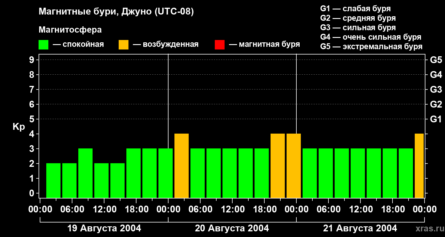 Изменения геомагнитного индекса Kp с 19 по 21 августа 2004 года для средних широт
