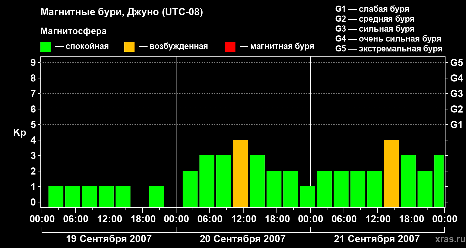 Изменения геомагнитного индекса Kp с 19 по 21 сентября 2007 года для средних широт