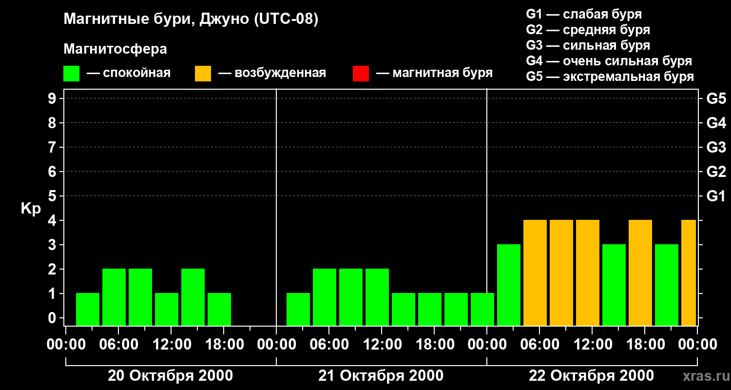Изменения геомагнитного индекса Kp с 20 по 22 октября 2000 года для средних широт