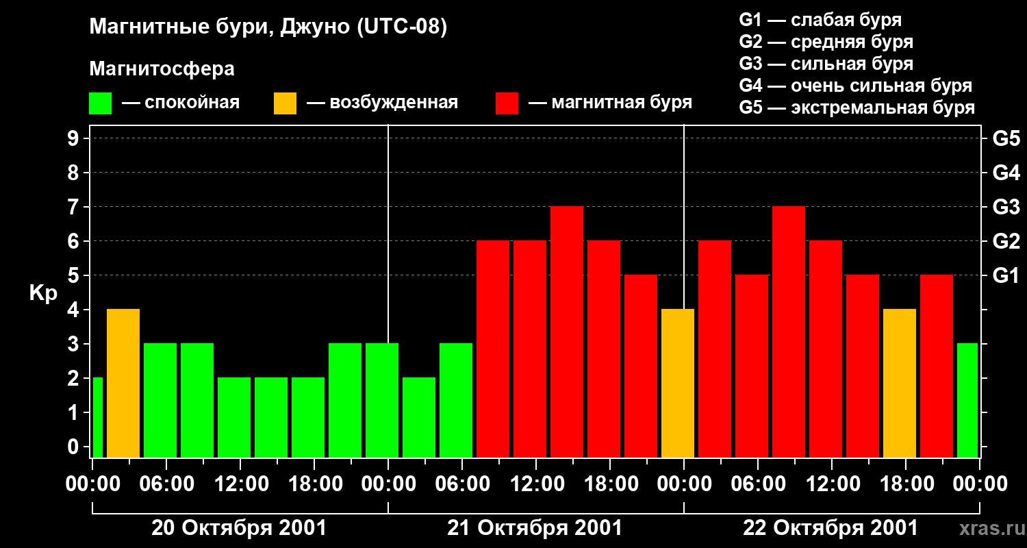 Изменения геомагнитного индекса Kp с 20 по 22 октября 2001 года для средних широт
