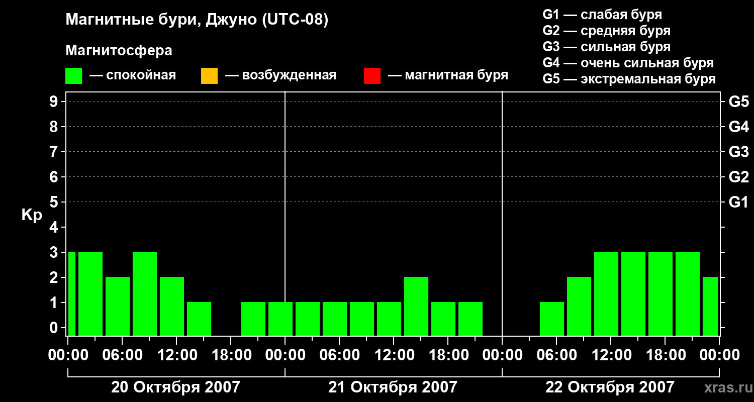 Изменения геомагнитного индекса Kp с 20 по 22 октября 2007 года для средних широт