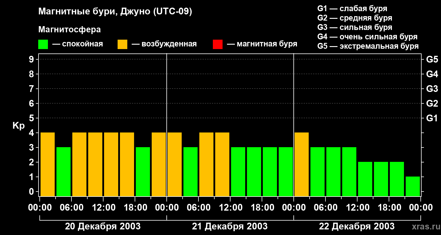 Изменения геомагнитного индекса Kp с 20 по 22 декабря 2003 года для средних широт