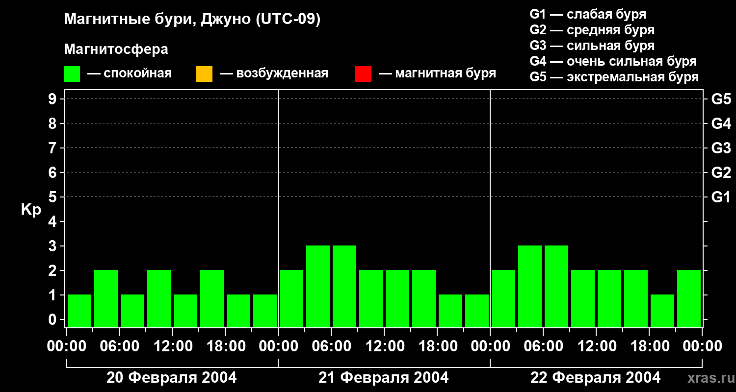 Изменения геомагнитного индекса Kp с 20 по 22 февраля 2004 года для средних широт